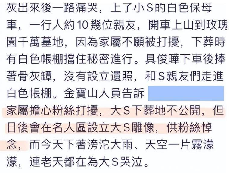 由于3月15日埋葬那天,金宝山风雨交集,因此有港媒这样写说念:“连老天齐在为大S抽搭。”