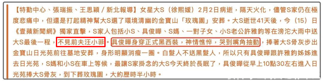 事实上,大S的这一次埋葬亦然精巧进行的,全凭S家的御用媒体对外显现音信。不外,由于御用记者无故提到“不见前夫汪小菲”,惹来了不少网友的不悦和吐槽。